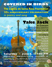 Covered in Birds, a benefit for the Laguna Foundation. Take Jack in concert, with readings by nine Sonoma County poets: Elizabeth Herron, Terry Ehret, Katherine Hastings, Jodi Hottel, Maya Khosla, Greg Mahrer, Phyllis Meshulam, Larry Robinson, and Mike Tuggle. Heron Hall, Laguna Environmental Center, 900 Sanford Road, Santa Rosa. Although this is now sold out, I hope to see some of you there!