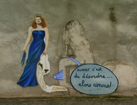 The next reading is Friday, October 28th and the theme is love. We’re emphasizing the complicated side of love — though you can do hearts and flowers, if you want. The theme is inspired by a mural on a wall in Montmartre, Paris, which features Rita Hayworth saying, “Aimer c’est du désordre, alors aimons!” (Love is messy, so love on!) I took a photo of it when I was there a few years ago. If you’d like to read and see your name on the flyer, just let me know. So far I have Dixon Wragg, Donna Emerson, Connie Madden, Michael Browne, Elaine Holtz and Ken Norton.