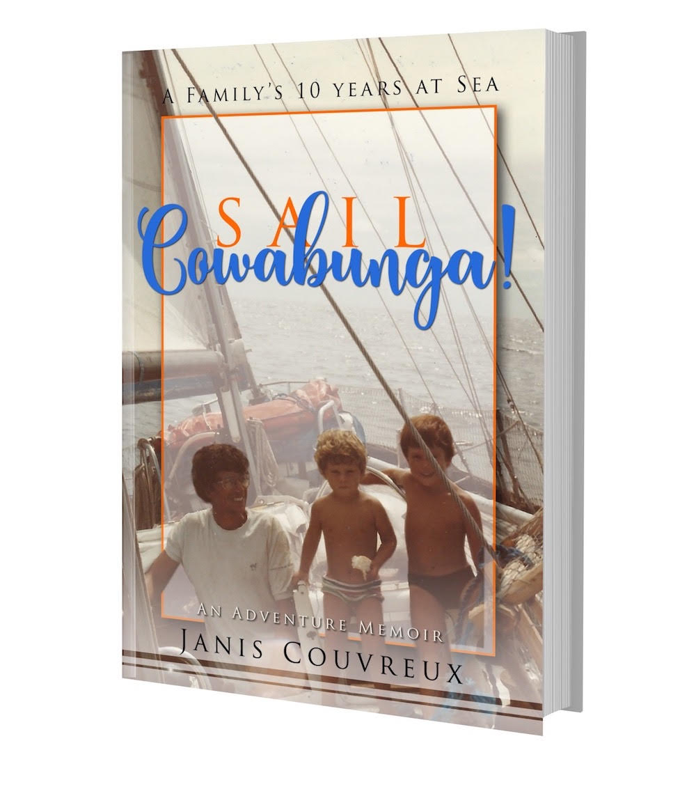 Sail Cowabunga! A Family’s Ten Years at Sea, Janis Lasky Couvreux’s adventure memoir of her family living and sailing on a sailboat with two small children from Bordeaux, France to San Francisco will be released on October 14, by Filles Vertes Publishing, and is now available for pre-orders. Janis chronicles their adventures, misadventures, tragedies, and glories across four continents all while recounting how they accomplished daily routines of cooking, schooling, sleeping at sea, and raising two boys from infancy to adolescence. An award-winning writer, journalist, Franco-American, lover of languages, travel and adventure addict, sailor, mom, and grandmom, Janis won the first place Adult Nonfiction award at the 2017 San Francisco Writers Conference for a segment of this debut book.